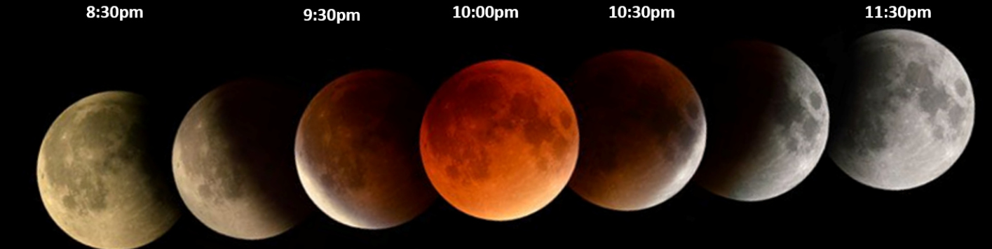 A total Eclipse of the Moon occurs on the evening of March 3. The Full Moon rises in the north-east at 7:42pm, just as the Sun is setting in the west. Whilst still in twilight, at 8:20pm, the Moon begins to enter the Earth’s shadow. Within minutes, the limb of the Moon starts to darken. The shadow marches across the face of the Moon, until 9:34pm, when the Moon enters the umbra, the darkest part of the shadow. We now have a Blood Moon. The depth of colour will be governed by the sunsets and sunrises around the world. The stars that would normally have been hidden in the bright moonlight sparkle in the darkened sky. The Milky Way is now clearly seen overhead. It takes the Moon 1 hour to travel through the umbra. At 10:32pm, the sky begins to brighten again. The changing appearance of the Moon during eclipse is shown below. All times are in ACDT, please adjust to your local time zone.