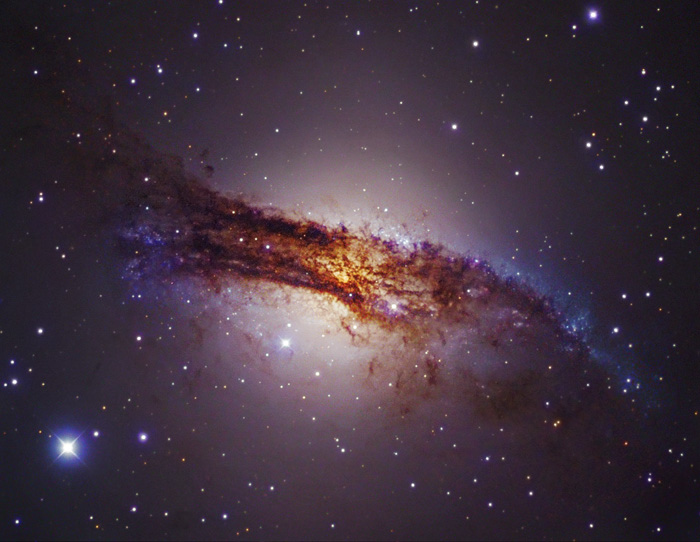 NGC 5128 is believed to be the result of the merger between 2 galaxies within the last billion years. Strikingly apparent within the galaxy are two major components, a large elliptical structure which generates about 90% of the luminosity and a massive disk of stars, dust and gas.