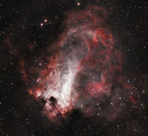 M17 is between 5,000 and 6,000 light-years from Earth, and it spans some 15 light-years in diameter. The cloud of interstellar matter of which this nebula is a part is roughly 40 light-years in diameter and has a mass of 30,000 solar masses. It is considered one of the brightest and most massive star-forming regions of our galaxy. Its local geometry is similar to the Orion Nebula except that it is viewed edge-on rather than face-on.