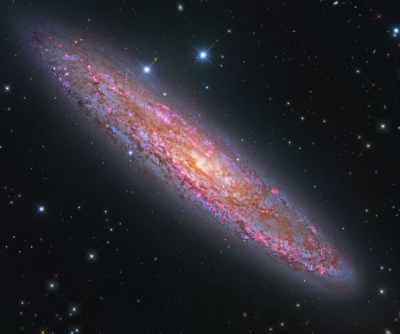 NGC 253 is the brightest member of the Sculptor Group of galaxies, which includes luminaries such as NGC 247, NGC 300, and NGC 55. The galaxy was discovered by Caroline Herschel in 1783 during one of her systematic comet searches.