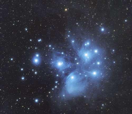 The rich blue clouds and delicate tendrils of reflection nebulosity surrounding the brightest members have their origin in an unrelated molecular cloud and do not represent the ancestral cloud which gave rise to the Pleiades.