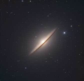 M104, located within the constellation of Corvus, the Crow, is truly a remarkable sight with its prominent glowing bulge bisected by a thick dusty disk. In the realm of galaxies its