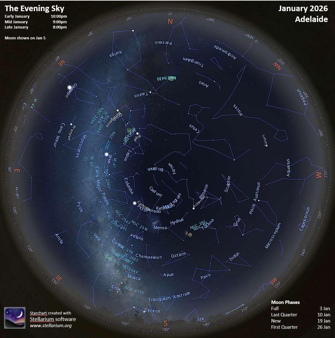 Get your last look at “ring-less” Saturn before we lose it in the glare of the sunset sky. As our angle of view changes, we will begin to see the rings in their glory by end of 2026. As we draw the curtains on what has been the major feature of 2025, we re-open them to greet the colossus of the solar system, Jupiter. Look for it amongst the stars of Gemini in the north-east at the end of twilight. This behemoth will keep us entertained over the coming months as we watch the merry dance of the 4 Galilean moons around the planet. More on Jupiter next month.