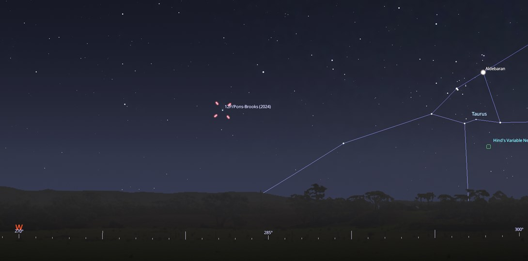 Looking west on the evening of April 27., 30 minutes after sunset. Locate the orange star Aldebaran, then scan to the left until you come to a fuzzy spot in the sky. Train your binoculars on it, the comet will be 239 million kilometres away. Graphic generated with Stellarium planetarium software.