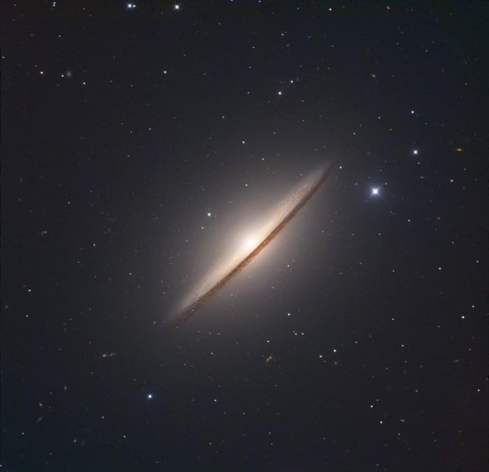 M104, located within the constellation of Corvus, the Crow, is truly a remarkable sight with its prominent glowing bulge transected by a thick dusty disk. In the realm of galaxies its haunting form is nearly an icon. M104 is a luminous and truly massive galaxy with an equivalent total mass of 800 billion suns. Its edge-on view has provided astronomers with insight into the organization of matter within spiral galaxies.